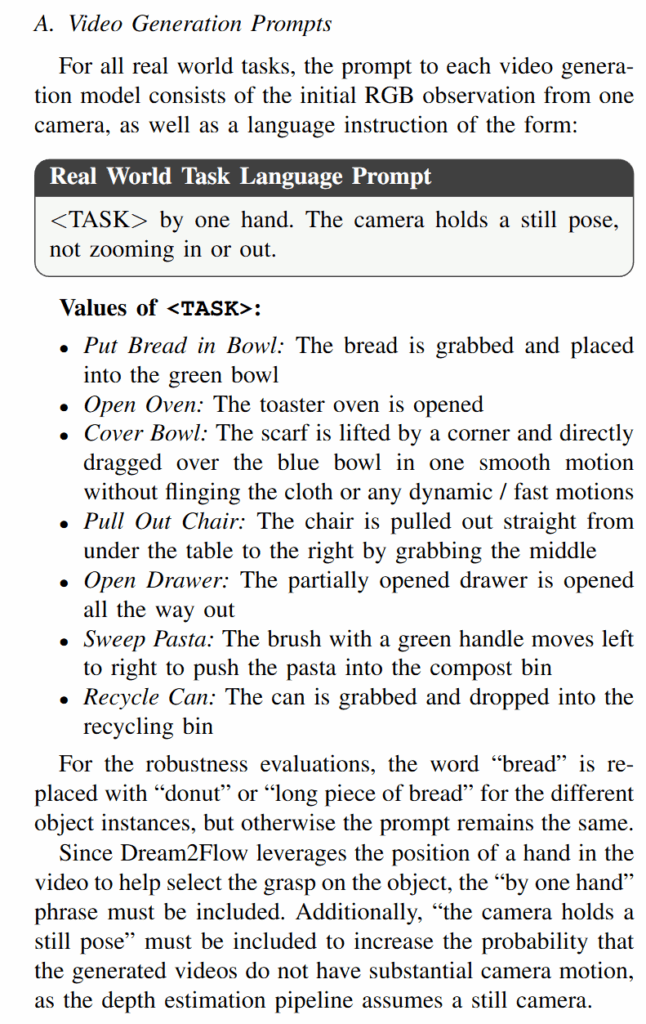 비디오 생성에는 Wan2.1, Kling 2.1, Veo 3와 같은 text conditioned image to video 모델들을 활용했다고 합니다. 이러한 모델들은 인터넷 영상으로 학습되어 인간이 물체를 다루는 물리적 상식이 내재되어 있기 때문에 활용했고, 오픈소스 모델들 보다는 veo 3가 성능이 좋다고 합니다. 점점 성능 좋은 모델들은 로컬에서 돌리기도 힘들고 애초에 오픈소스로 공개가 안 되는 것 같습니다. 비디오 모델의 입력으로는 로봇 작업 환경의 RGB-D 이미지와 text instruction이 들어갑니다. “Put the bread in the bowl”과 같이 작업을 한 문장으로 지시하며, 카메라는 정지한다와 같은 프롬프트를 추가하여 카메라 고정 및 부드러운 동작을 유도한다고 합니다. 또 이때 저자들은 로봇의 모습을 프롬프트나 초기 프레임에 포함하지 않는 것이 영상을 더 그럴듯하게 만드는 데 중요하다고 하빈다. 어찌보면 로봇이 작업하는 영상은 많이 학습을 안 했을테니 당연한 결과인 것 같습니다. fast motion, morphing, camera motion과 같은 negative prompt를 사용하여 객체의 급격한 왜곡이나 카메라 움직임 등을 억제하기도 했다고 합니다.