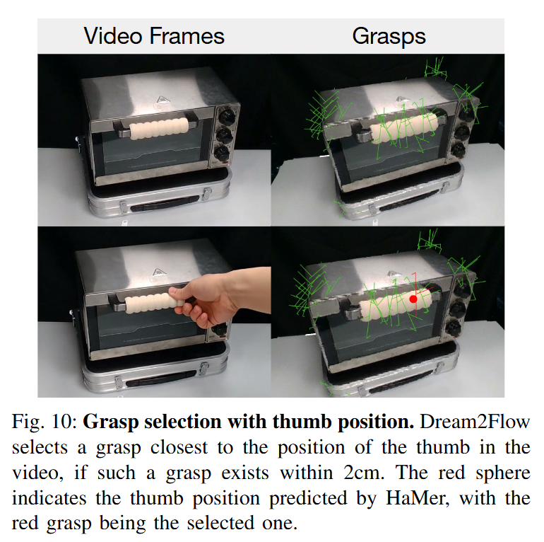 Push T 환경이 아닌 일반적인 grasping을 통해 작업을 수행할 때는 영상으로부터 추출된 3D object flow 중에서 실제로 움직이는 부분만 식별하기 위해 SAM 모델에 positive prompt(움직이는 부분)와 negative prompt(고정된 부분)를 주어 움직이는 영역의 마스크만 남기고 추적하는 기법을 사용했다고 합니다. 파지를 위해서는 AnyGrasp를 활용하여 grasping 후보들을 생성한 뒤, 생성된 영상에서 사람 손의 엄지 위치를 HaMer 모델을 기반으로 추론해 인간이 잡은 부분(엄지)과 가장 가까운 grasping pose를 사용했다고 합니다. 이렇게 하면 영상 속 상호작용에서 사람이 물체를 잡은 부분을 로봇도 동일하게 잡도록 유도해, 비디오 모델 (사람)이 의도한대로 행동할 수 있다고 합니다. 로봇이 물체를 집고 난 이후에는 PyRoki를 사용한 최적화 루프를 통해 객체의 흐름을 추적하며 움직였다고 합니다.