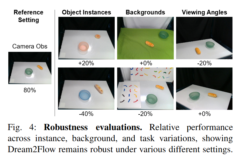 두 방법 모두 특정 상황에서는 가시적인 point의 수가 매우 적어져 변환 추정이 noise에 취약해지고, 이로 인해 로봇 실행 단계에서 불안정한 최적화 또는 실패로 이어지는 문제가 관찰되었습다고 합니다. 반면 Dream2Flow는 일부 점이 가려지거나 추적에 실패하더라도 나머지 점들을 통해 end effector 궤적을 유지할 수 있었으며, 이로 인해 실행 안정성이 상대적으로 높았다고 합니다. 특히 Cover Bowl과 같은 deformable 조작에서는 AVDC와 RIGVID 모두 강체 변환이라는 가정이 붕괴되어 거의 실패한 반면, Dream2Flow는 비교적 강건한 성능을 보였다고 합니다.