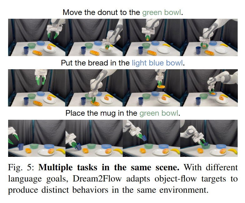 하나의 scene에서 얼마나 다양한 task를 수행할 수 있는지, task grounding은 잘 되는지에 대한 실험입니다. Video generation model이 text condition을 잘 입력받는 만큼 하나의 scene에서도 다양한 task를 성공적으로 수행할 수 있었다고 합니다.