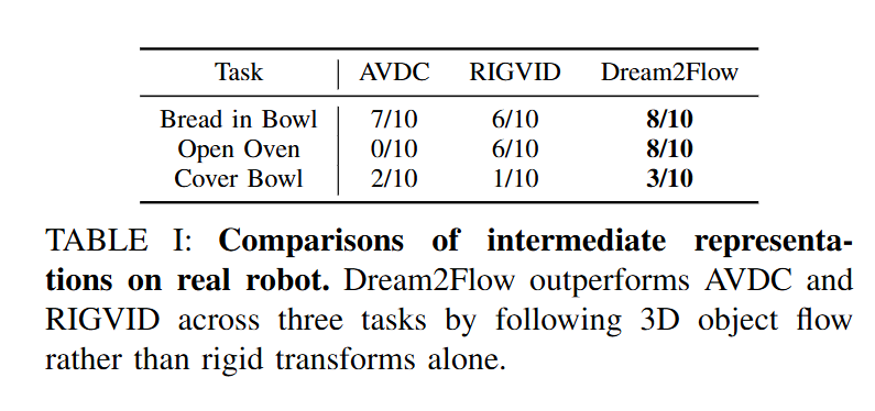 해당 실험에서는 3D Object Flow 인터페이스를 기존의 비디오 기반 객체 궤적 추출 방식들과 비교하여, 실제 로봇 조작에서의 성능을 비교했습니다. 비교 대상으로는 AVDC와 RIGVID 두 가지 방법을 사용하고, 결과는 아래 Table1고 ㅏ같습니다. Bread in bowl, open oven, cover bowl task에서 각각 10회씩 진행했고, AVDC는 생성된 비디오 프레임 간의 옵티컬 플로우를 계산해 객체의 2D 점 대응을 얻고 변환 시퀀스를 추정함으로써 파지 이후의 객체 궤적을 따라가는 방식입니다. RIGVID는 video depth를 통해 조작 대상 객체의 6D pose estimation을 추적하며 궤적을 생성하는 방법이지만, deformable (bread, cloth)에는 6D pose 정의가 불가능하기 때문에, 본 실험에서는 AVDC와 유사하게 3D point 사이의 강체 변환을 추정하는 방식으로 변형하여 평가하였다고 합니다.