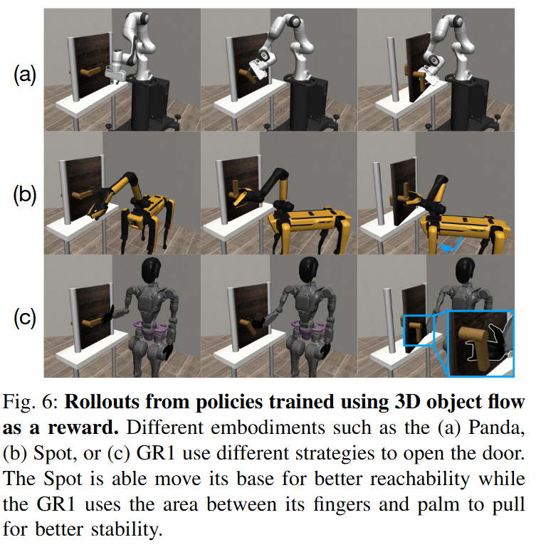 추가로 저자들은 강화학습과도 연계해, 문 열기와 같은 작업의 경우, 3d object flow를 reward로 하는 강화학습을 진행했다고 합니다. 시뮬레이터를 동역학 모델로 활용하여 SAC 알고리즘으로 policy를 학습시켰다고 합니다. 이러한 강화학습 기반의 방법은 객체 흐름을 embodiment 종류와 상관없이 따라갈 수 있도록 Franka, Boston Dynamics Spot, Fourier GR1 휴머노이드 등에서 학습할 수 있었다고 합니다. Flow를 따라감에 있어서 어찌보면 당연한 말이지만 Spot은 베이스를 움직일 수 있는 이점을 지니고, 휴머노이드는 손가락을 문고리에 끼워넣을 수 있는 이점을 지녔다고 합니다. 결국 비디오 생성 모델에서 현실과 정렬된 pointcloud를 추적하고, 이런 3d object flow를 어떻게 로봇의 행동으 연결시킬거냐?에 대한 구체적인 방법론들이 제시됐다고 보면 될 것 같스빈다.