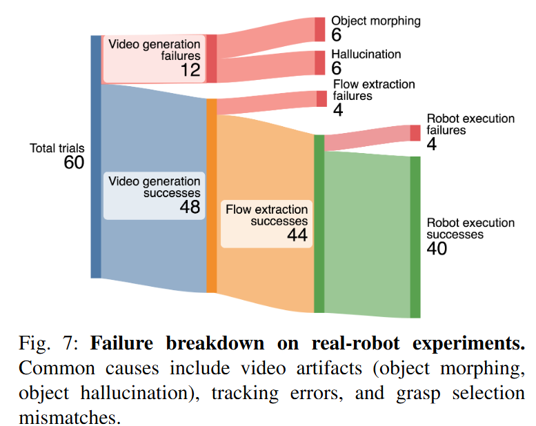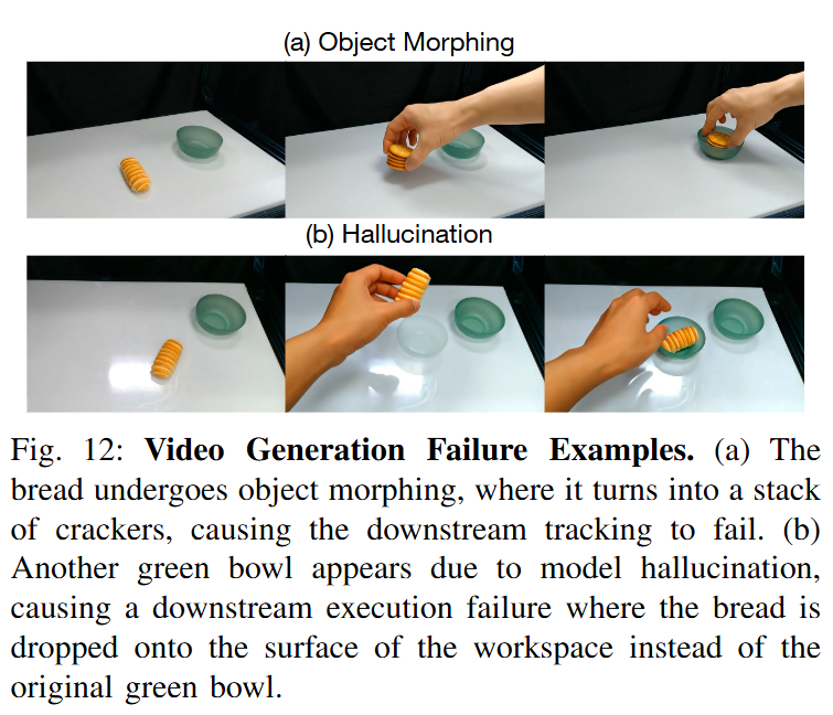 다음은 실패 케이스에 대한 결과입니다. 다양한 작업에서 총 60번의 trial을 진행했을 때, 20번의 실패가 있었는데 대부분은 video 생성이 완전하지 않기 때문이라고 합니다. Object morphing이나 hallucination인 비디오 생성 모델의 전형적인 문제는 당연하지만 병목으로 존재하는 것 같습니다.