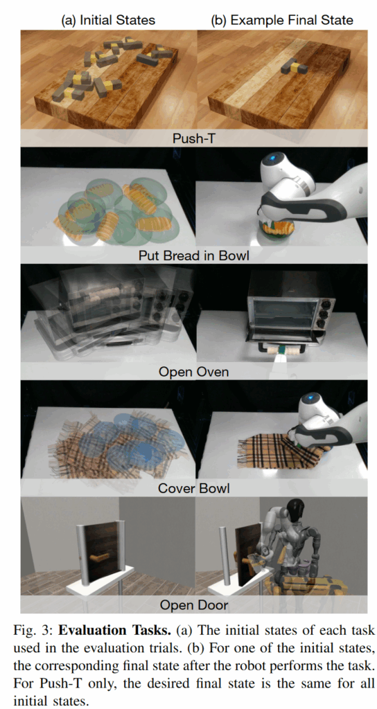 실험은 아래 사진과 같이 push T, put bread in bowl, open oven, cover bown, open door의 task로 진행했습니다. Initial States에서 반투명한 물체들이 겹쳐보이는 것은 다양한 initial state로 진행했다고 보시면 됩니다.