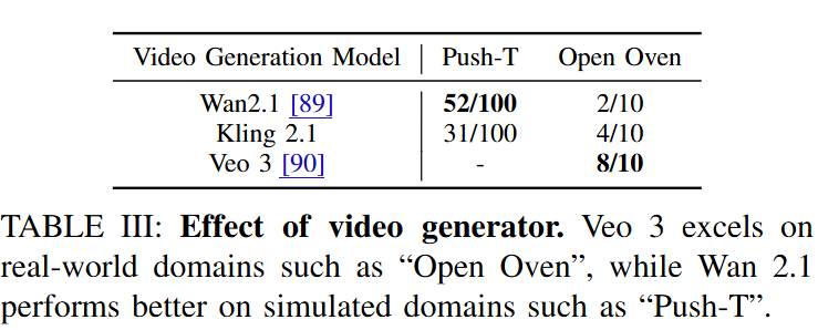 사용된 비디오 모델들에 대한 비교도 진행되었는데, Veo 3의 경우 input state와 goal state를 모두 이미지로 입력받지 못하기 때문에 평가에서 제외했고, Wan2.1과 Kling 2.1의 경우 각각 Push-T와 Open Oven에서 서로 다른 강점을 보였다고 합니다. Kling에서 substantial morphing이 더 많았다고 합니다. Open oven의 경우 Wan 2.1은 일관된 camera view를 유지하는데 실패했다고 하네요. 카메라 시점 고정이나 articulation의 표현 등 physically plausable한 모습은 Veo 3가 훨씬 좋았다고 합니다.
