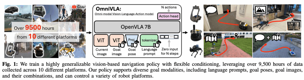 안녕하세요. 이번에 리뷰할 논문은 OmniVLA: An Omni-Modal Vision-Language-Action Model for Robot Navigation입니다. 2025년 9–10월쯤 아카이브에 올라온 논문인데, 읽어보니 현재 연구실에서 돌리고 있는 모바일 플랫폼에도 적용 가능성이 꽤 높아 보여서 한번 공유하고자 가져왔습니다.