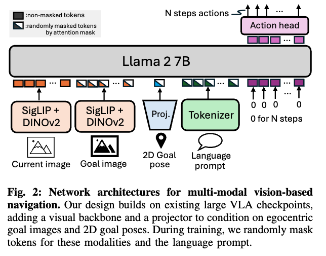 그림 2를 기준으로 보면 현재 관측(egocentric image)는 visual encoder(SigLIP+DINOv2)로 처리하는 것을 알 수 있고 목표(goal)는 세 가지 모달리티를 지원하는 것을 알 수 있습니다.