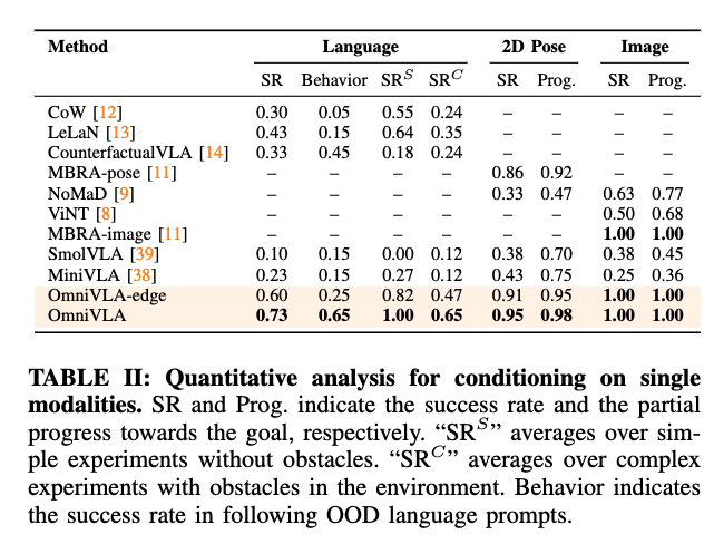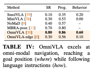표 II에서 OmniVLA가 모달리티별 specialist 베이스라인(각각 단일 모달리티만을 학습시킨 모델)을 전반적으로 성능을 넘어서는 결과를 보실 수 있습니다. 어떻게 보면 Q1에 대한 답을 보이는 실험표입니다. 여기서 저자는 모달리티별로 쪼개진 데이터셋보다 훨씬 큰 규모의 mixture로 학습했기 때문에, 결국 더 일반화된 내비게이션 능력이 나온다라고 주장합니다. 그리고 단순히 학습 데이터 많아서 이김으로 끝내는 게 아니라, 사전학습된 VLA 백본(아키텍처 선택)과 사전학습 데이터의 성격 자체가 성능에 크게 영향을 준다는 점도 언급합니다.