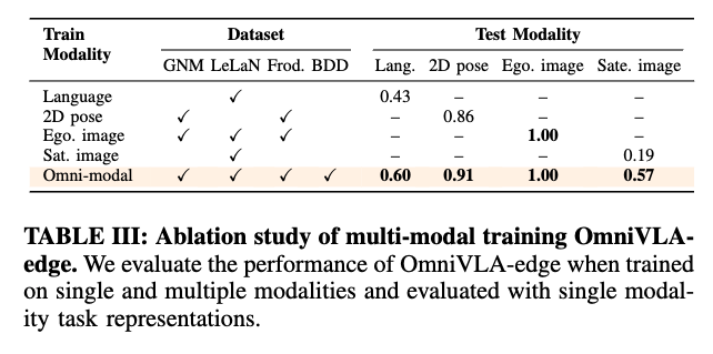 저자는 더 크고 다양한 데이터 mixture의 이점을 보이기 위해 아키텍처는 고정해두고(여기서는 OmniVLA-edge) 학습 데이터 구성만 바꿔서 비교합니다. 구체적으로는 OmniVLA-edge를 여러 버전으로 학습시키되,어떤 버전은 단일 모달리티 데이터만 보고 학습하고 그걸 멀티모달로 joint training한 OmniVLA-edge랑 비교하는 방식입니다.