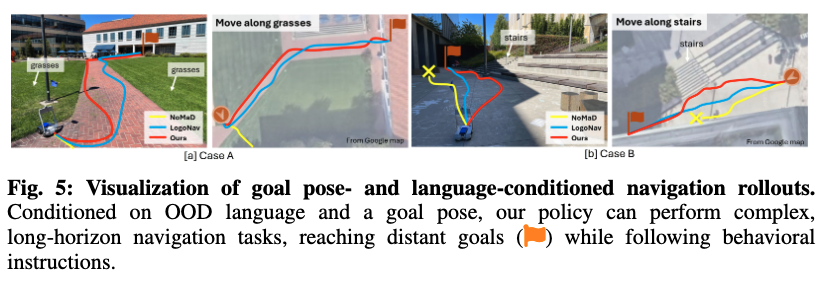 Q2에 답하기 위해서 저자는 10개 서로 다른 환경에서 태스크를 2D 목표 포즈와 행동을 지시하는 언어 명령 을 함께 제공하는 방식으로 지정하는 실험을 수행했다고 합니다. 각 환경에서 저자는 로봇의 초기 위치로부터 25–100m 떨어진 2D 위치를 제공하고, 동시에 로봇이 그 목표에 도달하기 위해 반드시 따라야 하는 행동을 명시하는 언어 프롬프트(예를 들어 “벽을 따라 이동하라”, “잔디 위로 이동하라”, “물체 A와 B 사이로 이동하라”)를 함께 제공하는 식으로 세팅하며, 이러한 프롬프트는 학습 데이터셋에는 포함되어 있지 않다고 합니다.