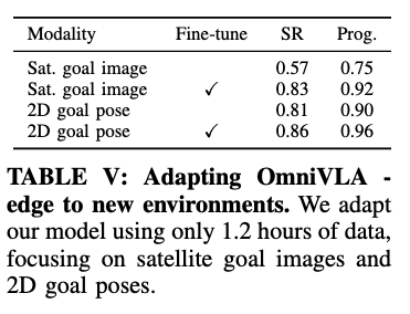 (a) 시나리오 같은 경우 훈련에서 보지 못한 환경에서 2D pose + 위성 이미지 포함 1.2시간 데이터를 모아서 OmniVLA-edge를 파인튜닝하여 평가 한 결과 표 V를 보면 두 모달리티 모두 성능이 오르는 것을 확인할 수 있습니다.