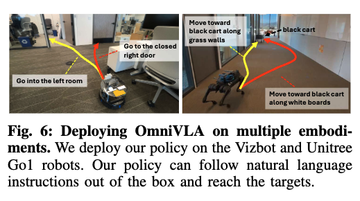 마지막은 cross-embodiment generalization을 실제로 보여주는 데모성 실험입니다. 그림 6 같은 경우는 바퀴형 VizBot, 4족 Go1에 서로 다른 카메라를 달고, 언어 조건부 내비게이션에서 테스트했을 때 OmniVLA가 지시를 따르고 목표에 도달하는 결과입니다.