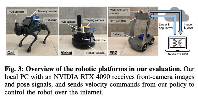 근데 대규모 데이터를 쓰면 일반화가 좋아지지만, 수집이 커질수록 노이즈가 늘어서 결과적으로 데이터가 덜 정확해 질 수 있는 문제가 있습니다. 그래서 저자들은 학습시 Frodobots이라는 데이터 셋 같은 경우는 MBRA 로 생성한 합성 행동을 사용하고 LeLaN 데이터 셋 같은 경우는 NoMaD로 생성한 합성 행동을 라벨로 사용했다고 합니다. 그리고 BDD-V 데이터셋(자율주행 차량 데이터) 같은 경우는 저자들이 하고자 하는 소형 로봇 데이터 셋 사이의 큰 embodiment 갭을 충분히 반영하지 못하는 데이터 셋입니다.