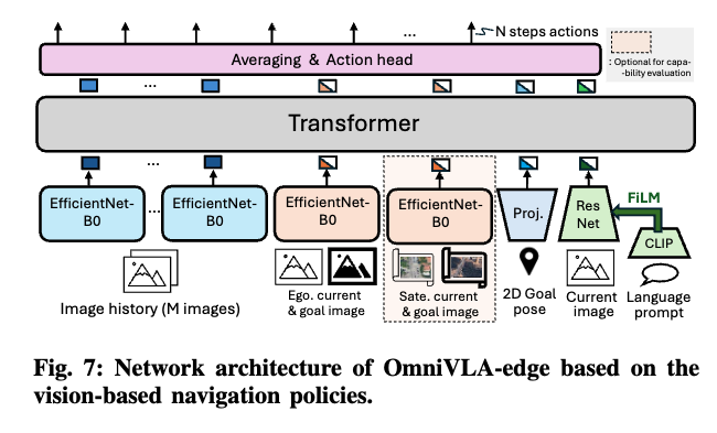 저자들은 이제 여기에 추가적으로 Edge 버전도 제안을 하는데, 논문이 단순히 OpenVLA(7B)로 끝이 아니라, ViNT 기반의 OmniVLA-edge도 같이 만듭니다. 이게 결국 현실 로봇 배포에서 7B 모델 추론이 부담되는 상황을 고려했을 수 도 있지만 해당 저자가 ViNT의 같은 저자임을 고려했을 때 그들이 일전에 제안했던 가벼운 파운데이션 모델을 안쓸이유도 없을 것 같긴합니다. 암튼 라마에 비해 상당이 라이트한 ViNT(50M)를 기반해서 목표 인코더들을 추가하고 modality dropout을 동일하게 적용해서 엣지한 옴니-모달 goal-conditioning을 또한 가능하다라는 것을 보여줍니다.