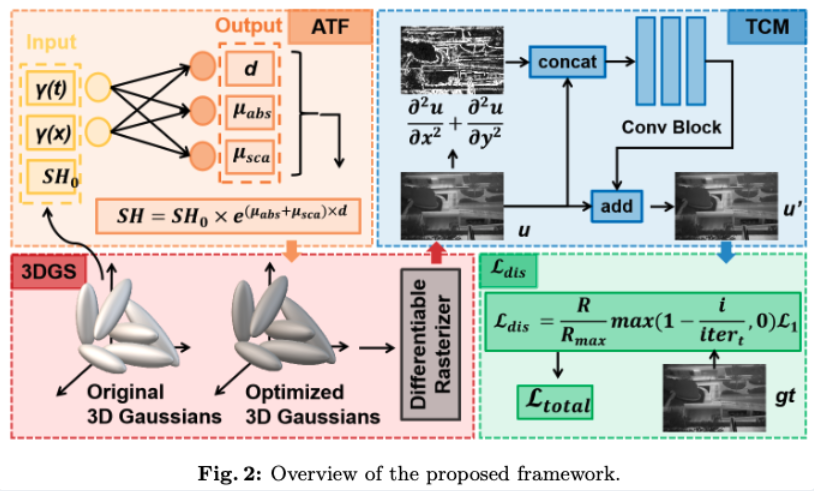 앞서 말씀들인것 처럼 이러한 물리적인 현상 첫번째는 대기전달 현상 두번째는 열 전도 현상으로 해석하고 이를 직접적인 물리기반 학습 모듈로 모델링하여 해결합니다. 구체적으로는, 대기 전달로 인한 감쇠효과는 3D gaussian level에서 처리하기 위해 Atomspheric Transmission Field(ATF)를 도입합니다. 또한 열전도로 인해 발생하는 경계 흐림 현상은 3D 구조의 문제가 아니라 영상 공간에서 나타나는 현상으로 간주하고 Thermal Conduction Module(TCM)을 통해