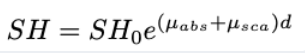 I_{0} 는 감쇠 이전의 열 복사 강도 \mu는 대기 중 입자에 의한 흡수 와 산란 효과를 포함하는 감쇠 계수 입니다. d는 물체–카메라 간의 대략적인 거리입니다. 여기서 감쇠 계수 \mu 는 \mu_{abs} + \mu_{sca} 입자에의한 흡수(absorption) 산란(scatter)로 표현할 수 있습니다.