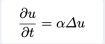 여기서 u는 열화상 이미지 상의 온도 분포를 의미하며, \Delta는 2차 미분으로 구성된 2D Laplacian 연산자입니다. 이 식은 열전도로 인한 온도 변화가 온도 분포의 곡률, 즉 2차 기울기에 의해 결정된다는 점을 의미합니다. 계수 \alpha는 물질의 열전도 특성을 반영하는 상수로, 열전도에 대한 반응 속도를 조절하는 역할을 합니다.