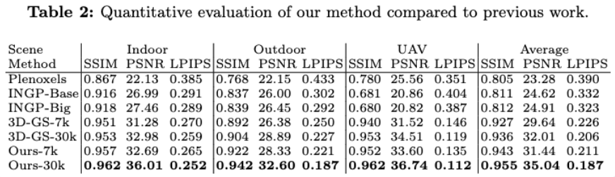 우선 저자들이 제안한 데이터셋을 통해 indoor , outdoor, UAV 에서 촬영한 데이터셋이 기존 3D GS 보다 평균 적으로 PSNR 기준 평균 약 3.03 dB의 개선을 달성합니다. 특히 기존 RGB 기반 NVS 방법들은 열화상 환경에서 밝기 불일치와 구조적 불안정으로 인해 성능 변동이 큰 반면, Thermal3D-GS는 비교적 안정적인 성능을 유지합니다.