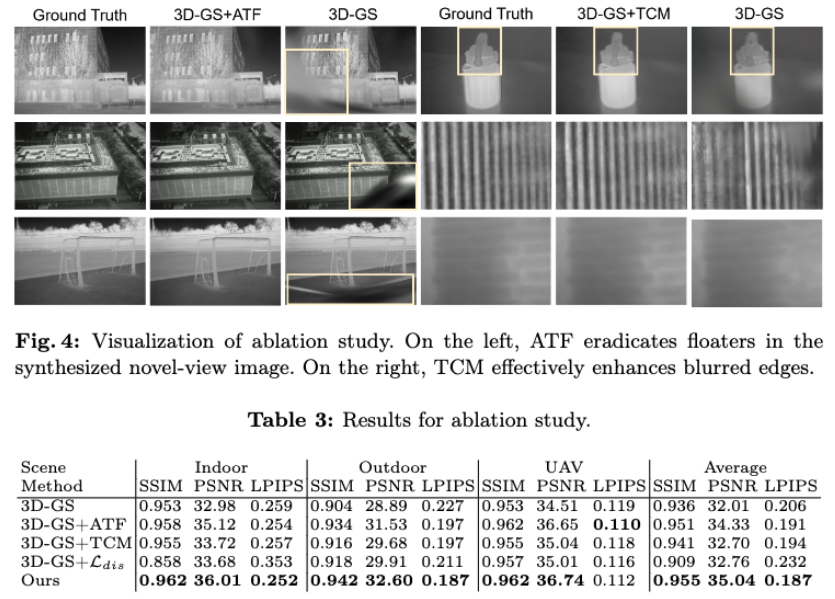 다음 으로는 Ablation study입니다. 먼저 기본 3D Gaussian Splatting 모델에 ATF만을 추가한 경우, 전반적인 재구성 성능이 눈에 띄게 향상됩니다. 특히 다중 시점에서 발생하던 밝기 불일치와 구조적 불안정이 크게 완화되며, PSNR과 SSIM 지표 모두에서 가장 큰 성능 상승을 보입니다. 이는 열화상 NVS에서 문제점인 시점·거리·대기 조건에 따른 intensity 불일치가 ATF를 통해 효과적으로 잘된 것 같습니다