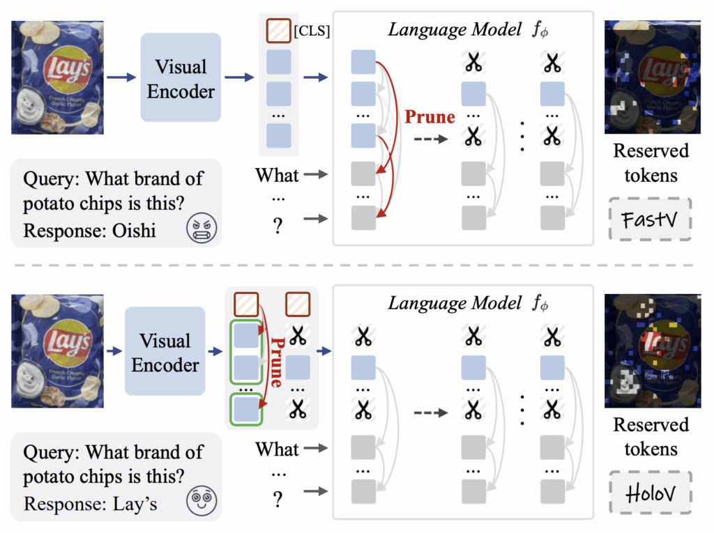 위 그림 1 상단에는 이전 방법론 중 하나인 “FastV”의 모식도가 나타나있습니다. FastV는 가장 직관적인 pruning 방법론이라고 보시면 됩니다. LLM layer 내부에서 계산되는 V-T attention weight를 각 토큰의 중요도라 보고, 그 중요도가 낮은 하위 R%의 토큰은 지운 뒤 뒷단으로 넘겨주는 것입니다. 이렇게 텍스트와의 상관관계를 바탕으로 pruning하는 방식도 있고, 반대로 [CLS] 토큰이 나머지 vision token으로 주는 attention weight를 점수로 삼아 pruning하는 vision-centric 방식도 있습니다. 저자가 본 논문에서 제안하는 HoloV도 후자에 속한다고 볼 수 있습니다.
