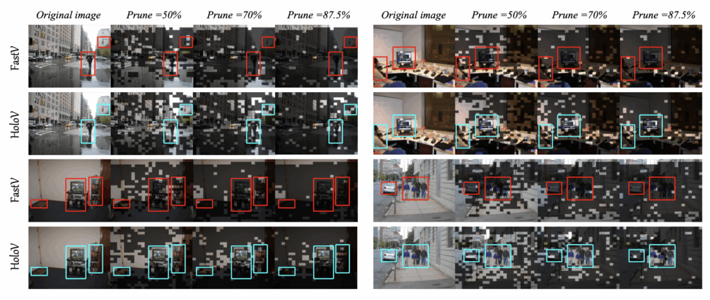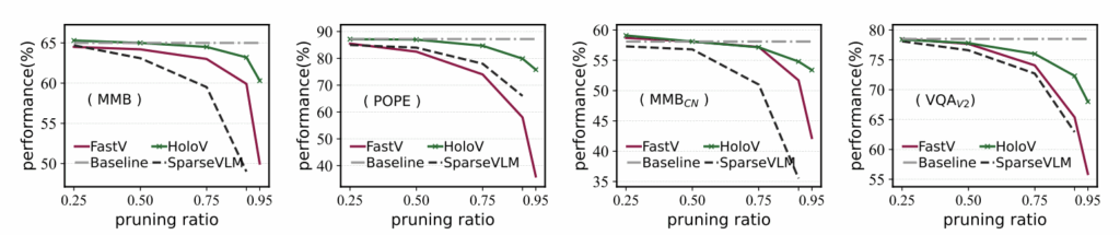 또한 그림 5에서는 pruning ratio 더욱 다양하게 바꿔가며 얻은 결과인데, FastV나 SparseVLM과 같은 단순 attention 기반 방법론들에 비해 HoloV는 굉장히 높은 pruning ratio에도 남겨진 토큰의 다양성이 유지(=이미지 전체 맥락 이해에 유리)되며 성능 방어에 상대적으로 성공하는 모습을 볼 수 있습니다.