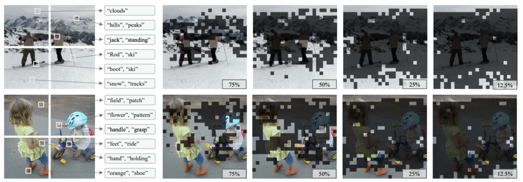 인지 과학에 따르면 사람은 시각 정보를 파악할 때 배경, 공간 구조와 같은 글로벌 정보와 자잘한 로컬 정보를 합쳐가며 이해를 완성한다고 합니다. 기존 text-mapping 분석 방식을 활용해 visual token과 text 단어 간 매핑을 진행해본 결과가 그림 3 왼쪽에 나타나있습니다. 왼쪽 상단에 스키타고 있는 그림은 몇 개의 흩어진 토큰으로 설명이 가능하다고 볼 수 있는데요. 예를 들면 여러 지역에 걸쳐 흩뿌려져 있는 “snow”, “ski”, “hills”와 같은 3개 단어만 있어도 이 장면을 설명할 수 있다는 뜻입니다. 앞서 저자가 이야기했던 주요 토큰들이 바로 저 단어에 상응하는 vision token들이라고 볼 수 있습니다.