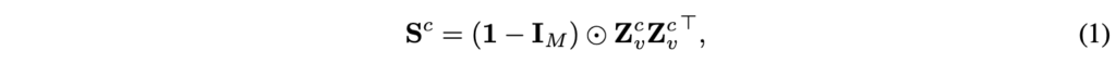 이렇게 얻은 c번째 crop에 대한 feature를 Z_{v}^{c} \in{} \mathbb{R}^{M \times{} d}라 할 때, 해당 crop 내부 토큰간 유사도 matrix S^{c}를 아래 수식 (1)과 같이 계산합니다.