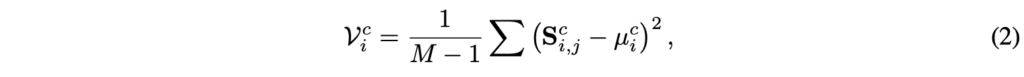 다음으로는 아래 수식 (2)를 통해 crop 내에서 한 토큰이 다른 토큰들과 얼마나 다른지 아래 수식 (2)와 같이 구해줍니다. 수식상 현재 토큰이 갖는 유사도 벡터S_{i}^{c}의 분산을 보는 것입니다.