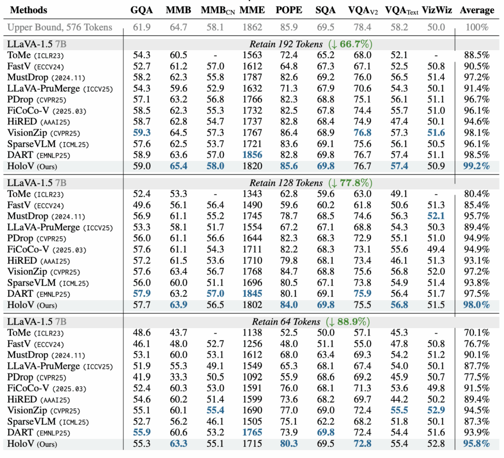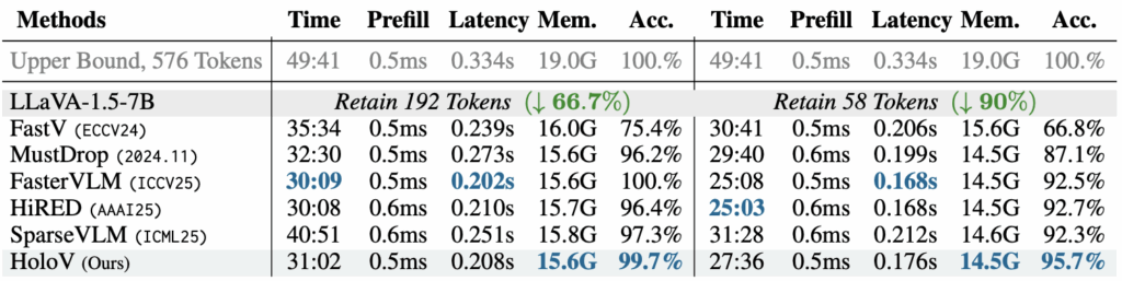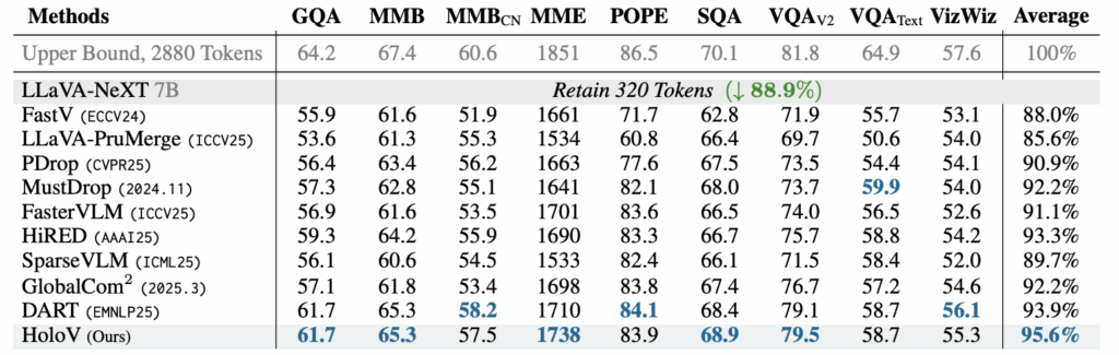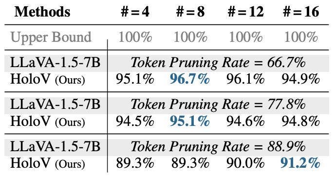 표 2에는 이미지 당 2,880개의 토큰을 소모하는 LLaVA-NeXT 7B 모델에 HoloV를 붙였을 때 성능을 보여주고 있습니다. LLaVA-NeXT는 AnyRes라는 vision token 생성 전략을 활용해 입력 이미지의 다양한 해상도에 대응할 수 있도록 설계되어있습니다. 이러한 전략에도 HoloV는 잘 맞아떨어져 베이스 LLaVA-NeXT보다 88.9%의 토큰을 덜 사용했음에도 95.6%의 성능을 유지하였습니다.