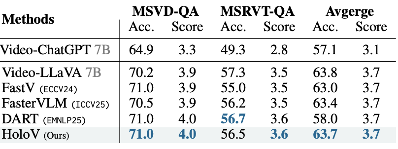 HoloV 방법론은 잘 학습된 모델의 평가 과정을 최적화하는 기법이니 별다른 학습 과정은 없습니다. 평가는 여러 visual benchmark 데이터셋에서 진행되었습니다. Image understanding 관련해서는 흔히 사용되는 GQA, MMBench, MMB-CN, MME, POPE, VizWiz, ScienceQA, VQA v2, TextVQA, MMVet를 평가했습니다 . 또 video QA 관련해선 MSVD-QA, MSRVTT-QA를 평가에 썼다고 합니다.
