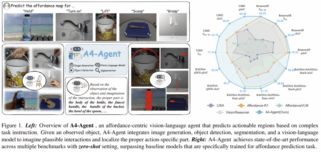 affordance는 상호작용이 이루어지는 영역을 인식하는 것으로, 기존의 모델들은 high-level reasoning 모델과 low-level grounding 모델을 하나의 파이프라인으로 통합하고, 과도한 annotation 데이터에 대한 학습에 의존하는 경향이 있었습니다. 이로인해 일반화 성능의 한계가 존재하였으며, 해당 논문은 training-free 방식의 에이전트 기반 프레임워크인 A4-Agent를 제안하므로써 일반화 성능을 높이고자 하였습니다. A4-Agent는 (1) 생성모델로 상호작용이 어떻게 이루어질지를 시각화하는 Dreamer, (2) Large VLM으로 상호작용이 이루어지는 물체 영역을 결정하는 Thinker, (3) VFM을 통해 실제로 상호작용이 이루어지는 영역을 찾는 Spotter로 구성됩니다. 해당 논문은 task에 특화된 데이터로 학습을 하지 않고도, 다양한 벤치마크에서 zero-shot 방식으로 기존의 학습 기반의 SOTA 방법론을 능가하는 일반화 성능을 보였으며, real-world 세팅에서도 강인하게 작동함을 입증하였습니다.