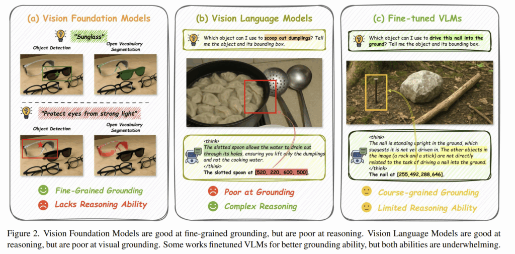 Affordance prediction은 지시문을 이해하여 어떤 물체 부위(what)에서 어떻게(how) 상호작용이 이루어지는 지 인식하는 high-level reasoning과 시각적으로 상호작용이 어디서(where) 이루어지는 지 인식하는 low-level grounding 능력이 요구됩니다. 위의 Figure 2는 foundation 모델에 대해 나타낸 것으로, (a)VFMs는 영역을 찾는 능력이 좋지만, 복잡한 지시문을 이해하여 의미론적으로 대응되는 영역을 찾는 reasoning 능력이 부족합니다. (썬글라스는 잘 찾지만, 빛으로부터 눈을 보호하는 역할에 대해서는 이해하지 못하고 있죠.) (b)MLLMs는 인상적인 reasoning 능력을 보이지만, 종종 공간적 이해 능력이 부족하여 정밀한 affordance 예측에는 한계가 있습니다.(“… scoop out dumplings”라는 명령에 대해, 구멍이 뚫린 스푼은 육수는 빠져나가도 만두만 건질 수 있다고 굉장히 잘 추론하였으나, 그에 대응되는 box 영역은 엉뚱한 부분을 나타냅니다.) 기존 패러다임은 단일 end-to-end 모델을 grounding 데이터로 학습시킴으로써 이를 해결하고자 하였으나, Figure 2의 (c)와 같이 둘을 결합한 패러다임은 이상적 결과로 귀결되지 않았으며(예시는 못을 땅에 박으려면 어떤 물건을 사용해야하는 지 지시문이 주어졌을 때, 돌과 나무가 직접적으로 연관되지 않는다는 답변과, 못의 bounding box를 반환하고있는데, 사실 추론을 통해 돌로 박을 수 있다는 답변을 할 수 있으나, 거기가지 추론이 도달하지 못하였다는 것을 보여주고자 한 것으로 보입니다.), 근본적으로 다음과 같은 한계가 존재합니다.