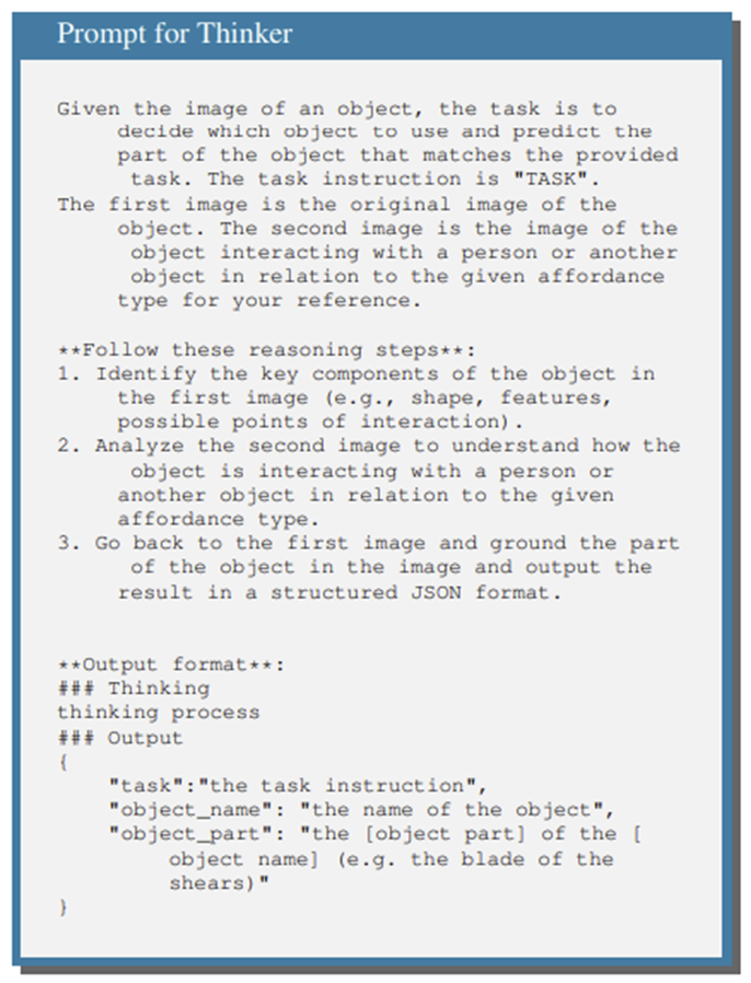 출력은 자유 형식으로 추론 과정을 나타내는 Thinking과, 기계가 판독 가능한 Output JSON을 출력하도록 합니다. Output JSON에서 "task", "object_name", "object_part"을 파싱하여 사용하며, object part는 "the [object part] of the [object name]" 형태로 표현됩니다. 이렇게 구한 affordance에 대한 text description \mathbf{D}는 text 형태로, 추론 과정을 해석 가능하도록 합니다.