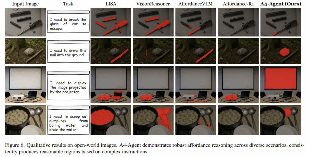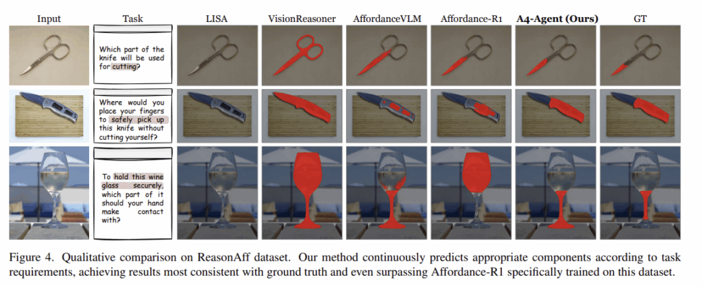 Table 1는 암묵적인 지시에 대하여 추론이 요구되는 ReasonAff 데이터 셋에서의 실험 결과를 리포팅한 것 입니다. A4-Agent는 학습 없이도 모든 지표에서 SOTA를 달성하였으며, 학습 기반 방법론인 AffordanceLLM와 강화학습 기반의 방법론인 Affordance-R1과 비교했을 때 뛰어난 추론 능력과 일반화 성능을 보였습니다. 이는 reasoning과 grounding을 분리함으로써 상호보완적인 강점을 활용할 수 있으며, 상상을 기반으로 추론하는 과정을 통해 추상적인 지시를 보다 잘 이해할 수 있었으며, 학습 데이터로 한정되지 않기 때문에 더 다양한 지시어로 일반화가 가능한 것으로 분석하였습니다. 아래의 Figure 4는 정성적 결과를 나타냅니다. 제가 affordance grounding 실험을 할 때, 와인잔에 대한 “hold”의 경우 와인대를 잘 표현하지 못하여 어려움을 겪었는데, 해당 모델에서는 제가 다른 이미지로 실험해보았을 때도 아래의 예시와 같이 해당 부위를 정확히 찾는 것을 확인할 수 있었습니다.