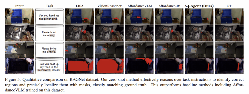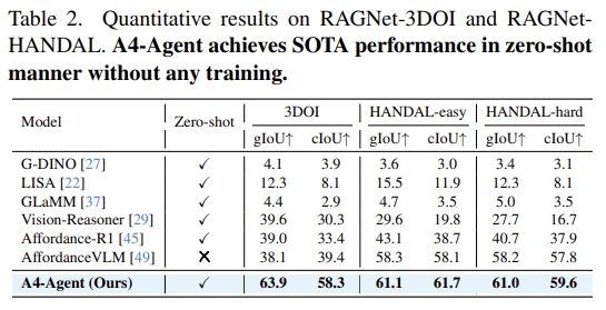 Table 2는 추론 기반의 affordance segmentation에 초점을 둔 RAGNet 데이터셋에서의 실험 결과로, A4-Agent가 다른 방법론들과 비교했을 때 뛰어난 성능 개선이 이루어졌음을 확인할 수 있습니다. 아래의 Figure 5가 정성적 결과이며, 마찬가지로 A4-Agent가 학습 기반의 방법론인 AffordanceVLM보다 우수한 성능을 보였습니다. 이는 복잡한 추론이 필요한 경우에 작업에 특화된 fine-tuning보다 에이전트를 조합하는 이러한 프레임워크가 더 효과적임을 입증하였으며, reasoning과 gronding을 구분하는 것이 효과적임을 다시한번 보여줍니다.