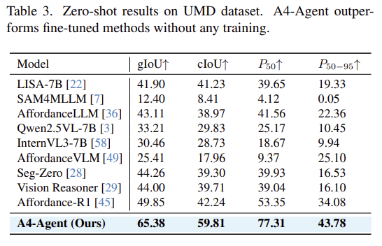 Table 3은 action 라벨로부터 Affordance 영역을 추론하는 전통적인 연구에서도 잘 작동함을 입증하기 위한 실험 결과입니다. 마찬가지로 zero-shot 방식이지만 학습 기반의 방법론들보다 더 뛰어난 성능을 달성하였습니다.