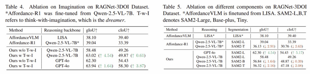 - Table 5는 각 구성요소에 대한 강인성을 분석한 것으로, Qwen-2.5-VL를 GPT-4o로 대체할 경우 성능이 유의미하게 개선되는 것을 확인하였으며 이후 더 강력한 모델이 등장하면 업데이트를 통해 계속 확장이 가능함을 보였습니다. 또한, SAM2-Large를 더 작은 SAM2-Base-Plus/Tiny로 대체할 경우 성능이 소폭 하락하지만, 전체적인 프레임워크는 여전히 기존 방법론보다 뛰어나며, Affordance-R1에서의 성능 저하보다 더 작은 성능 저하가 일어남을 어필하며 방법론의 강인성을 어필합니다.