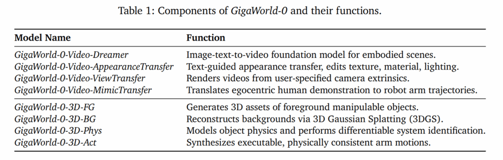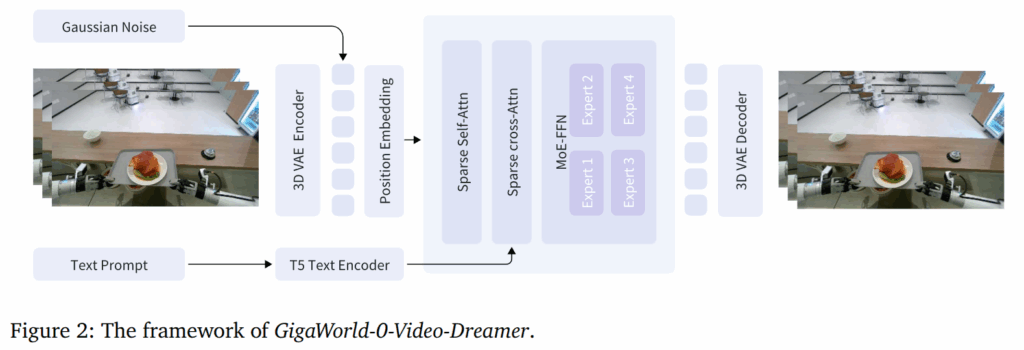 GigaWorld-0는 앞선 다룬 바와 같이 사실적인 영상을 생성하기 위한 GigaWorld-0-Video와 물리적, 기하하적 제약 을 준수하기 위한 GigaWorld-0-3D로 구성이 됩니다. 해당 기법들은 구체적으로 아래와 같은 expert로 구성됩니다.