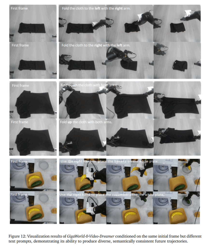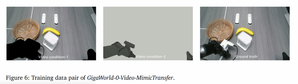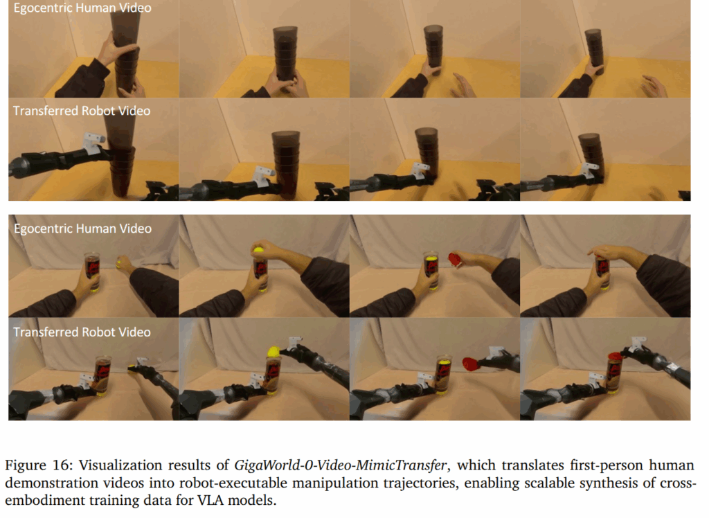특히, GigaWorld-0-Video-MimicTransfer는 사람의 1인칭 조작 시연 영상을 로봇이 실행 가능한 궤적으로 변환하여 cross-embodiment generalization이 가능하도록 합니다.