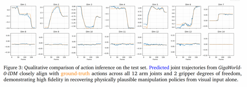 동일한 초기 프레임에서 시작하더라도 서로 다른 text prompt가 입력된다면 다른 형태의 generated video sequence V를 생성 할 수 있습니다. 그럼 이를 기반으로 GigaWorld-0-IDM f_IDM은 joint-angle trajectory를 예측합니다. 이렇게 얻은 비디오-로봇 액션 쌍은 실제 로봇을 직접 구동할 필요 없이 대규모 VLA 모델 학습에 사용 가능합니다. GigaWorld-0-IDM의 성능은 fig 3에서 볼 수 있습니다.