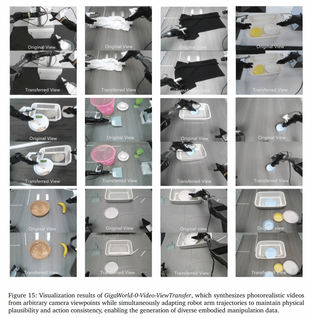 Function as Data Engine. GigaWorld-0-Video-ViewTransfer는 scalable viewpoint augmentation engine로 작동합니다. Fig 15에서 보이는 바와 같이 단일 비디오가 주어지면 기하학적으로 일관된 로봇 행동을 동반하면서 임의의 새로운 시점으로부터 사실적인 관측값을 생성할 수 있습니다. 이는 추가적인 데이터 수집 없이 모델에게 다양한 egocentric data를 대규모로 확장간으하게 하여 시점 변ㅂ화에 대한 강건성을 향상 시킬 수 있게 합니다.