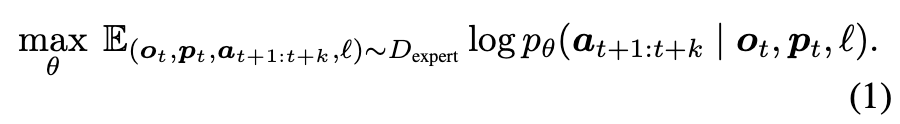 p_\theta(a_{t+1:t+k} \mid o_t, p_t, \ell)
