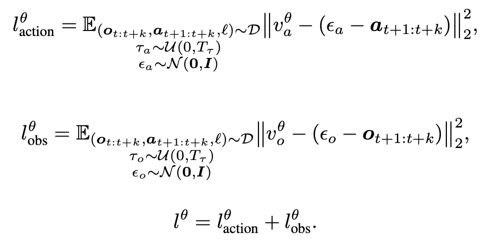 여기서 o_t는 condition frame이며, o_{t+1:t+k}a_{t+1:t+k}는 이후의 observation과 action sequence를 의미합니다. \tau_a, \tau_o는 각각 action과 observation에 할당된 timestep이고, \epsilon_a, \epsilon_o는 Gaussian noise이며, v^\theta_a, v^\theta_o는 unified model이 예측한 velocity field입니다. \ell^\theta_{\text{action}}\ell^\theta_{\text{obs}}는 각각 action과 observation에 대한 loss입니다.