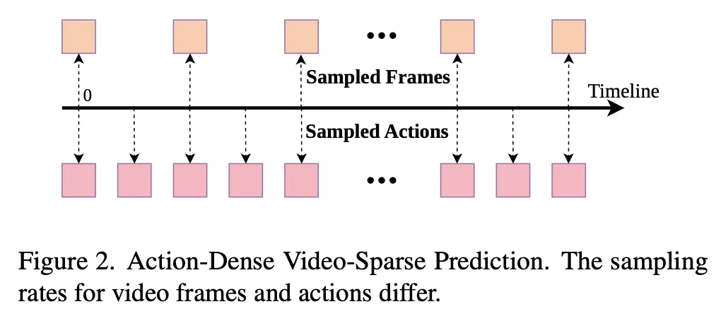 이러한 token 불균형은 모델이 video prediction에 과도하게 맞춰 학습되도록 만들고, 결과적으로 action prediction 성능을 약화시키는 원인이 됩니다. 이를 해결하기 위해 저자들은 Fig. 2 와 같은 Action-Dense Video-Sparse Prediction 전략을 제안합니다. 학습과 inference 과정 모두에서 video frame을 downsampling하여 video token과 action token의 개수가 균형을 이루도록 하는데, 예를 들어, action frame rate 대비 video frame rate를 1/6 수준으로 설정하는 방식입니다. 이를 통해 video 예측의 중복을 줄이면서도 action prediction에 필요한 정보는 유지하도록 설계했다고 합니다.