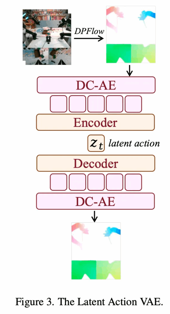 motion을 표현하기 위한 자연스러운 표현으로 요즈음의 방법론들이 그렇듯 optical flow를 채택했습니다. 전체 구조는 Figure 3을 보시면 됩니다. optical flow는 연속된 frame 사이의 pixel-level displacement를 포착하는 representation으로 쓰이는데, 본 논문에서는 DPFlow라는 기법을 사용해 optical flow를 계산한 뒤, 이를 RGB 이미지 형태로 변환합니다. 특히 고차원인 flow representation을 control-level space로 압축하기 위해, deep convolutional variational autoencoder(DC-AE)를 사용합니다. DC-AE는 optical flow를 재구성하면서 동시에 이를 512차원의 token 4개로 인코딩합니다. 이후 lightweight encoder를 통해 이 4 × 512 feature를 하나의 14차원 vector로 projection하는데, 이는 일반적인 robot action space의 규모와 유사하게 맞춘 것입니다. 이러한 차원 정합성 덕분에 latent representation은 실제 robotic control과 자연스럽게 alignment될 수 있으며, perception과 action을 연결하는 bridge 역할을 수행할 수 있다고 합니다.