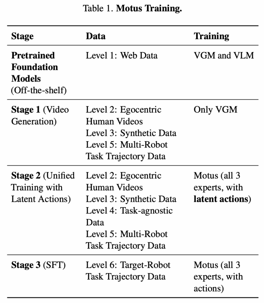 이 피라미드는 데이터의 정보 밀도와 policy relevance를 기준으로 각 데이터 유형을 계층적으로 정리한 구조입니다. Motus는 web-scale의 간접적인 데이터부터 target robot demonstration까지, 총 여섯 단계로 구성된 데이터 레벨(Tab. 1. 다시 참고.)을 학습 단계별로 효과적으로 통합하고 정렬하는 걸 목표로했는데, 이를 통해 서로 이질적인 여러 데이터셋을 하나의 일관된 모델 아키텍처 안에서 통합할 수 있다고 설명합니다.