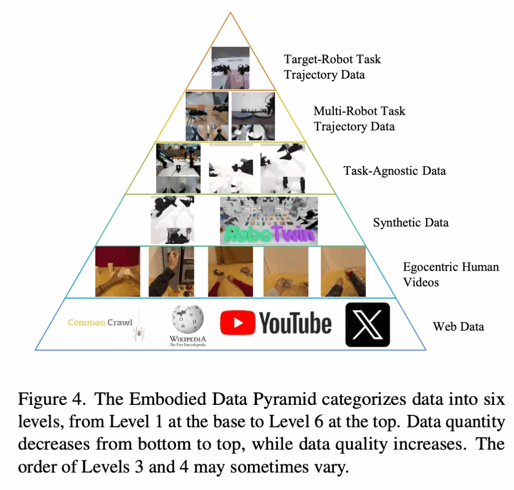 visual modality가 포함되지 않은 데이터 유형(예: language + action)은 visuomotor policy learning에 적합하지 않다고 보고 제외했다고 합니다. 그리고 나머지 데이터 유형들은 embodied policy 학습에 활용 가능한 전체 스펙트럼을 구성했다고 하는데,, 이러한 데이터의 다양성을 구조화하기 위해, 저자들은 아래 fig. 4. 와 같은 embodied data pyramid를 도입하였습니다.