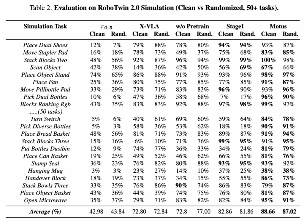 Motus는 π0.5와 X-VLA를 포함한 SoTA 방법들과 비교됩니다. 모든 모델은 simulation 환경에서 평가되며, baseline 중 π0.5에 대해서는 real-world task에서도 추가로 성능을 측정합니다. 또한 from-scratch로 학습한 모델과 Stage 1까지만 학습한 모델을 Motus와 비교해, 단계별 학습 전략의 효과도 함께 분석합니다.