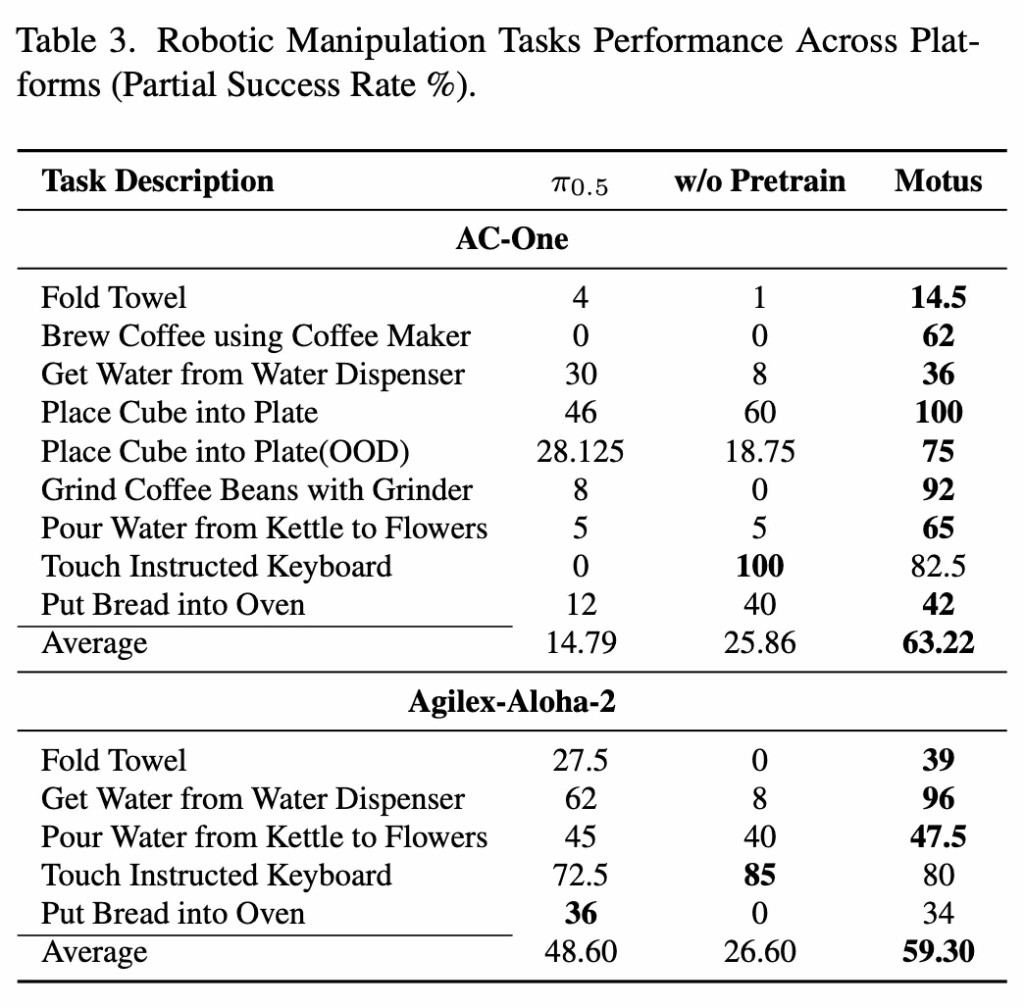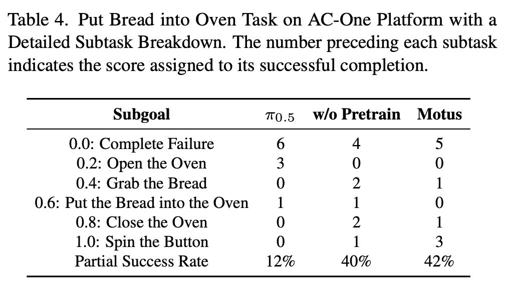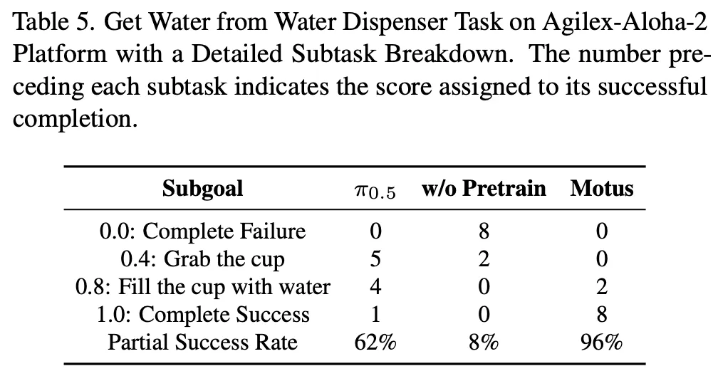 아래의 Table 4, 5를 보면 real환경 subtask 실험에서, Motus가 높은 성능을 보이는데, 특이한점은, w/o pretrain일 때 태스크에 따라서 다소 미비한 성능을 보인다는 점입니다. 그래도 시사점은 1.0에 대핟ㅇ하는 최종 성공까지가는 경우가 많은 것이 Motus인 점을 보면 여러 sub-task로 쪼개어져 태스크를 수행해야되는 Long-horizon 세팅에서도 Unified model이 강력한 성능으로 이끌 수 있음을 보였음이라고 보면 되겠습니다. 사실 이 분야에 follow up이 매우 잘 되어있지 않아 깊은 고찰은 아직까지는 쉽진 않네요.. 노력하겠습니다.