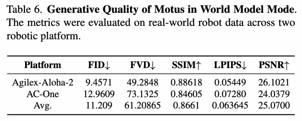 아래는 Table 6입니다. Motus의 World Model 모드에서의 생성퀄리티에 대한 평가인데요. 기존의 다른 방법론과 따로 비교를 한 건 아니고 self-evaluation이라 사실 어느정도의 수준인지는 파악이 안되는 상황입니다. 논문에서도 추가적인 설명이 없어서 아쉽네요.